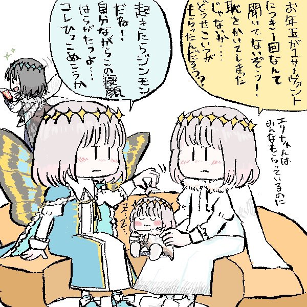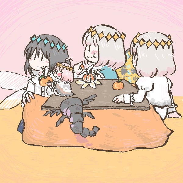 26 99 こたつで過ごす妖精達 描き納めにするはずが年を越してしまった絵 🧚♂️こたつにはメロンじゃなくてミカンが合うかな? 23/01/01 22:34