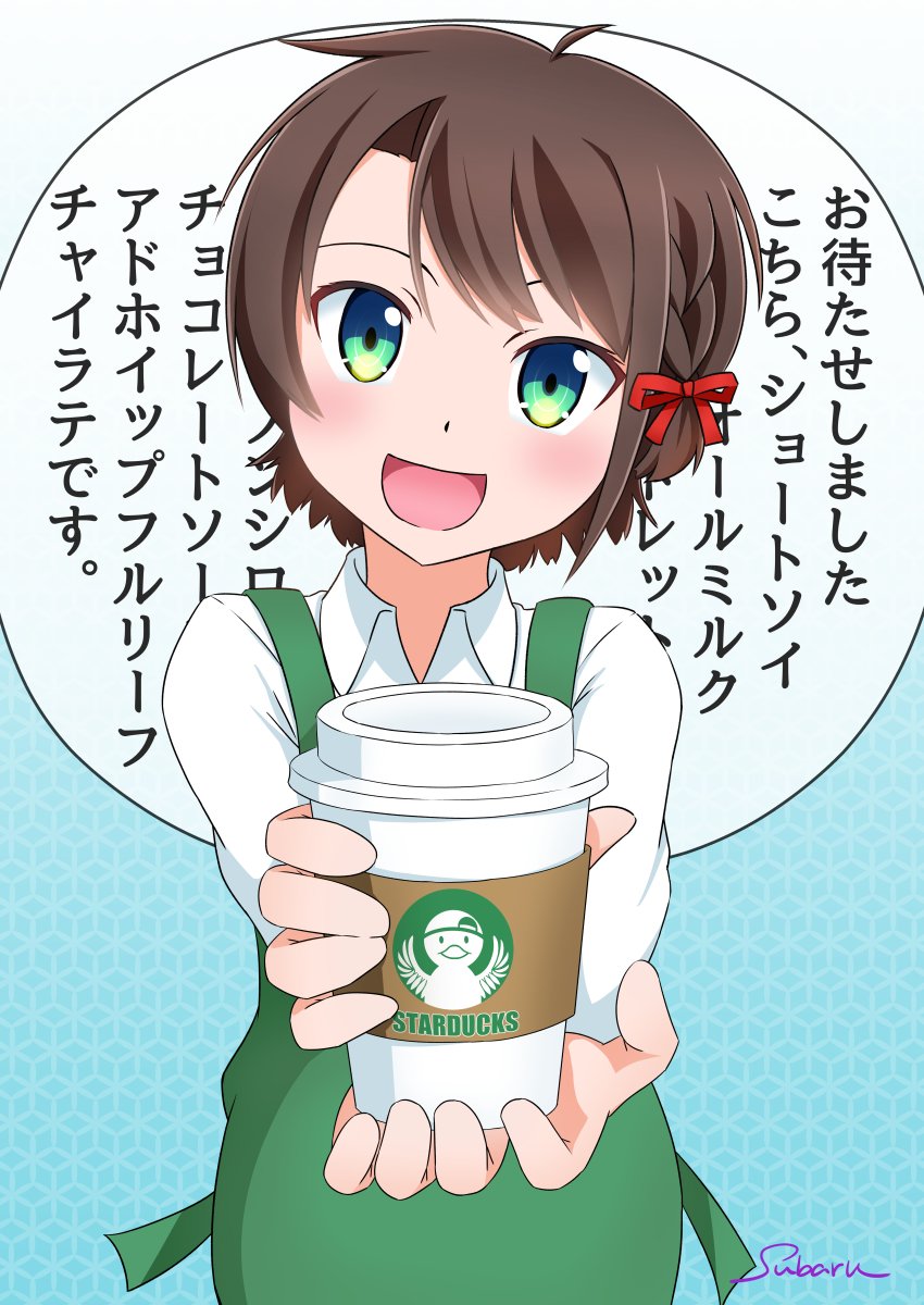 お待たせしました。こちら、ショートソイオールミルクアドリストレットショットノンシロップチョコレートソースアドホイップフルリーフチャイラテです。 #プロテインザスバル