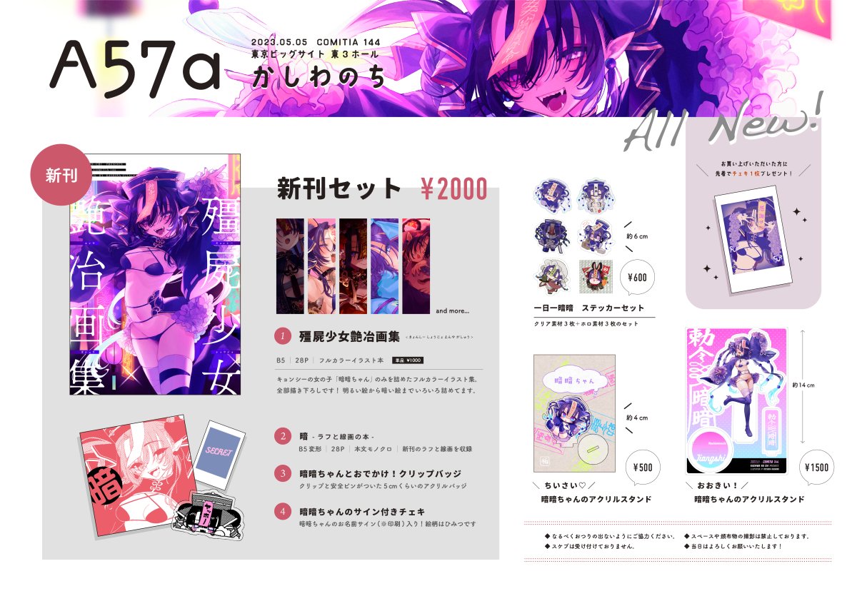 【5/5 コミティア144】お品書きです! A57a「かしわのち」でお待ちしてます🍃 フルカラーイラスト本含む、新刊セットもあります◎ アクスタなどもコミティア初参加のため全部新作です〜。 実物写真は届き次第ツリーで追加します。 よろしくお願いいたします!👻 #コミティア144 #COMITIA144