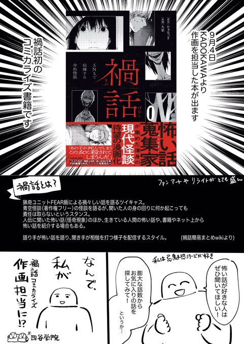 586 1301 【お知らせ】KADOKAWAさんより作画を担当した禍話のコミカライズ書籍が出ます 23/07/20 23:41