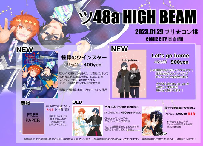 7 8 1/29 プリ★コン18のお品書きです! ナツさん(@natu_to_up)のトキ音本を委託(当日当スペースおられます!)させて頂きます。 新刊と既刊のエレコダは🐯さんにて通販致しますのでご利用ください! 新刊▼pixiv.net/member_illust.… よろしくお願いします💜❤️ 23/01/25 19:47