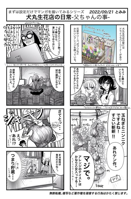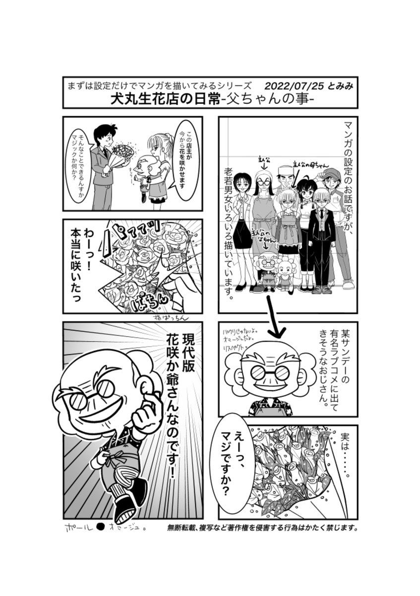 設定を先行していて、内容がまだ未着手なので、とりあえず8コマ形式でマンガを少しずつ描いてみることにしました。 題名は「犬丸生花店の日常」。おチビ父ちゃんは指パッチンでつぼみの花を咲かせる事ができます。 #創作漫画 #漫画が読めるハッシュタグ