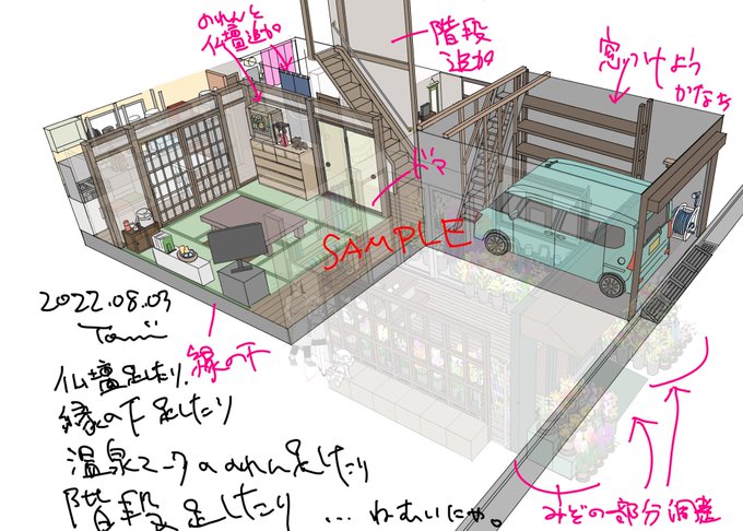 今週は花屋の隣のガレージの設定一考。ガレージには車、物を置く棚、水場、2階へ続く階段。水場ではバケツ洗ったり、ホース伸ばして植木に水あげたり。配達と自家用車も兼ねてタント。側溝とか段差描いたり。。。 #創作漫画 #漫画が読めるハッシュタグ #犬丸生花店の日常 #犬丸生花店の日常の設定