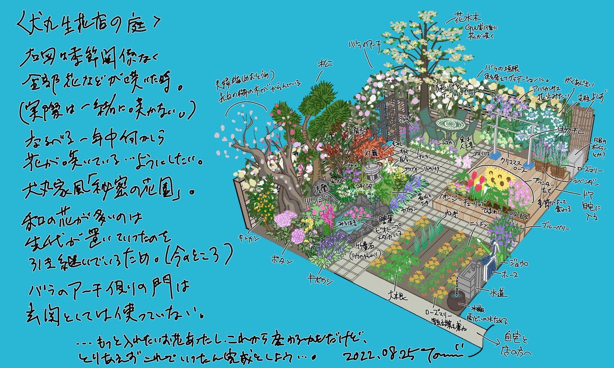 コロナで思うように進まなかったけど、やっと庭の設定を描きました! 松、竹、梅、菊、春蘭、牡丹。。。と言った画題があるのは趣味ですw #創作漫画 #漫画が読めるハッシュタグ #犬丸生花店の日常 #犬丸生花店の日常の設定