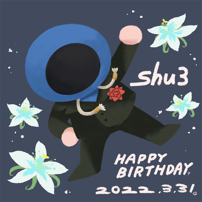 #shu3誕生祭2022 shu3仮お誕生日おめでとうございます!!🎊スマブラVIP超検証まじ面白かったです!動画に配信にナポリにコラボまで益々活躍の幅を広げていてそのバイタリティに感服します✨これからの活動も楽しみにしてます!イラストは怪人コピーダンス勝利ポーズより。花はブレワイの姫しずかです🥳