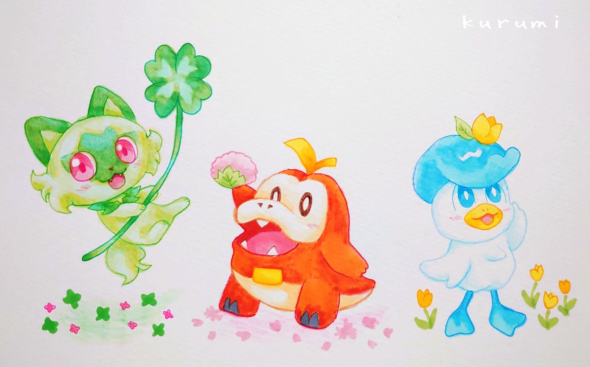 3 15 #ポケモン #コピックイラスト ニャオハとホゲータとクワッス🍀🔥🫧 3月なので春らしく描いてみました🥰🌸 23/03/04 19:12