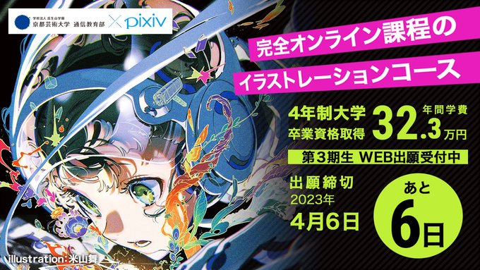 【ピクシブ×京都芸術大学】 \⏳出願カウントダウン⏳募集締め切り6日前‼️/ 出願の締め切りは【4月6日(木)】まで‼️ 💻WEBから簡単に出願できます✨ #京都芸術大学イラスト 🔻出願はこちらから🔻 tenohira.kyoto-art.ac.jp/illustration/