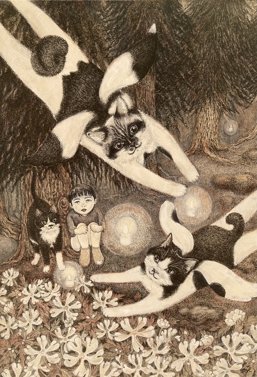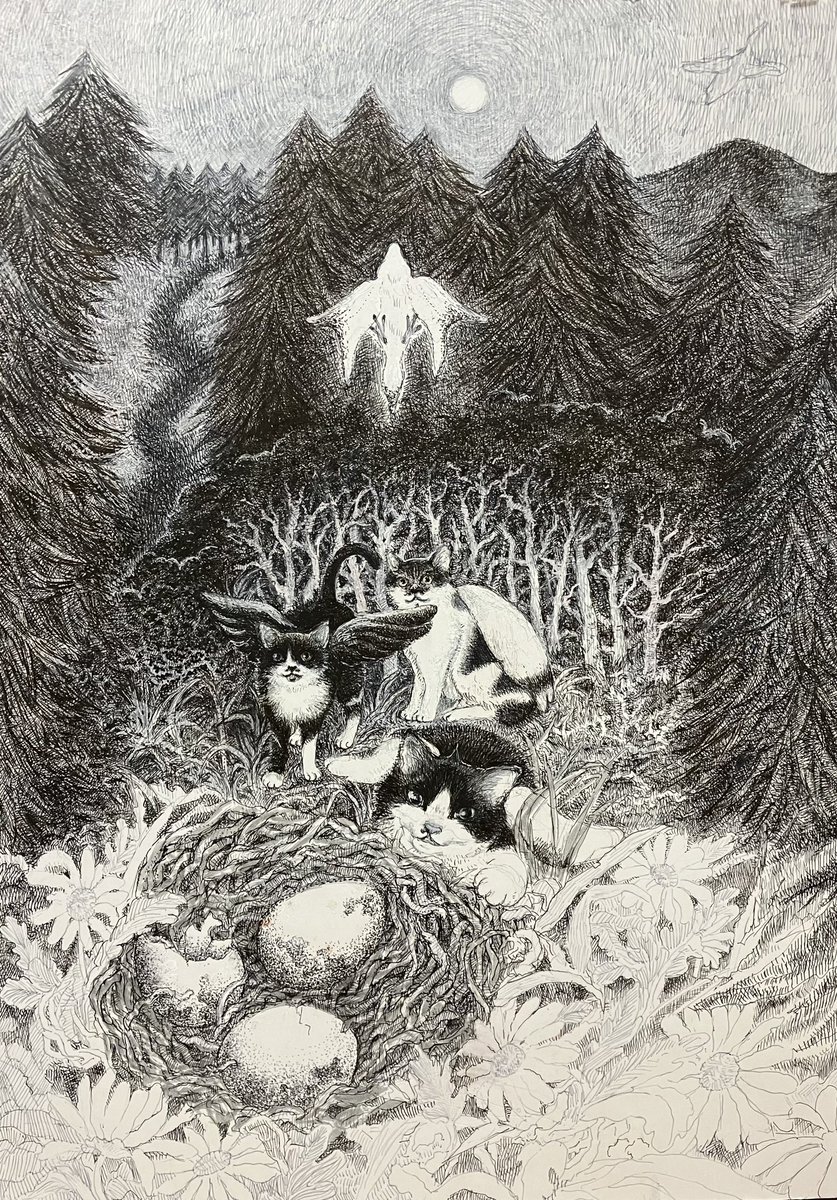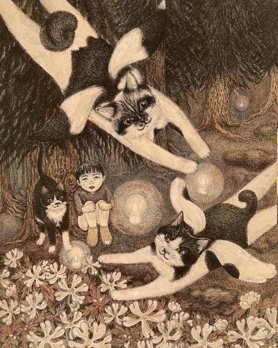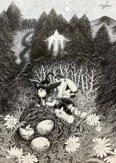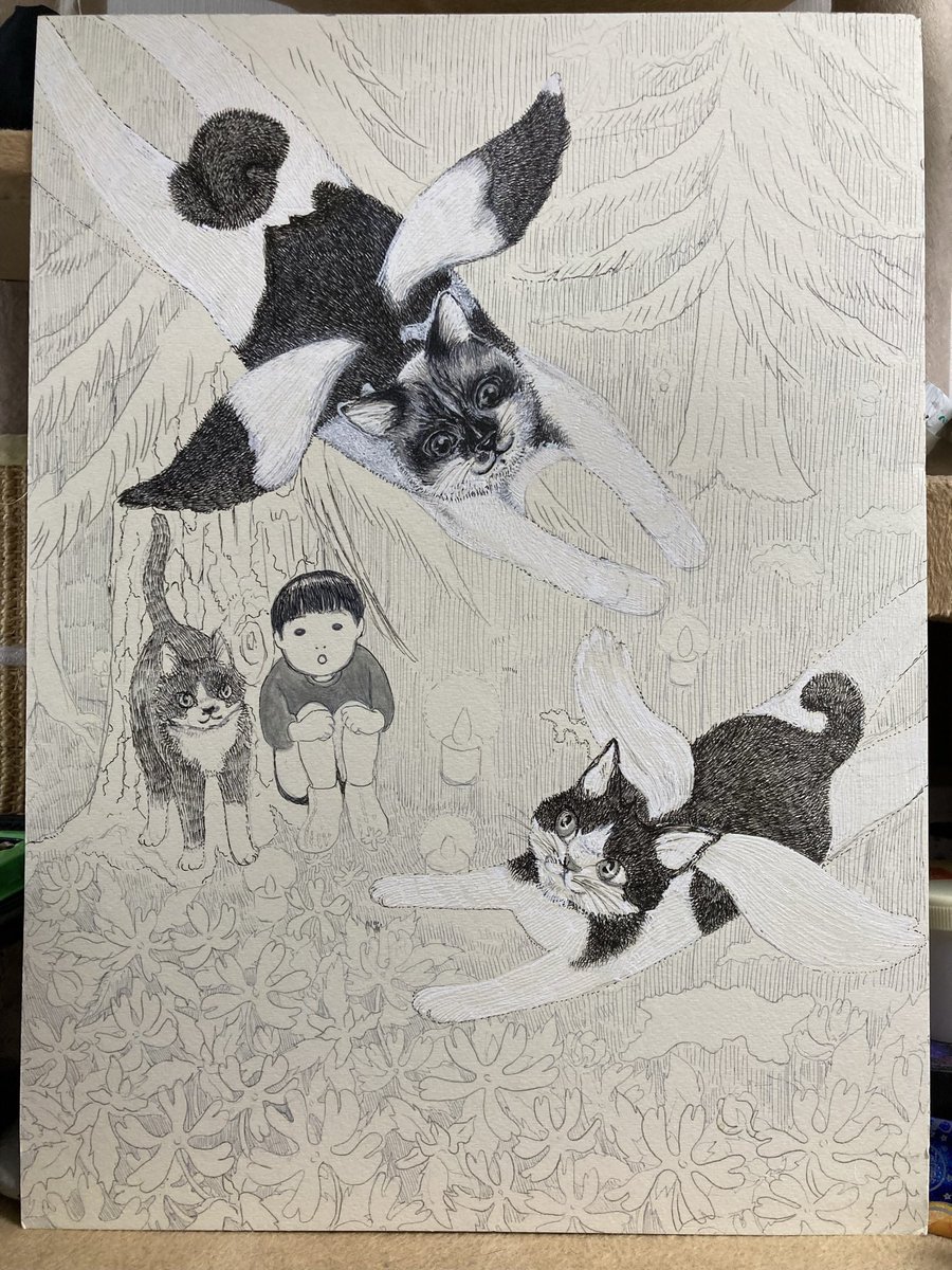 gallery hydrangea様の企画展「猫が眠る街」に出展したB4サイズのペン画の出来るまで。 仕上がりまでが果てしなく長かったけれど終われば楽しい思い出に。 題名は「夜咲く花と翼猫」、モデルは飼い猫たちです。 ギャラリーで通販頂いてます。 gallery-hydrangea.square.site/shop/-/40 #ペン画 #cat #illustration