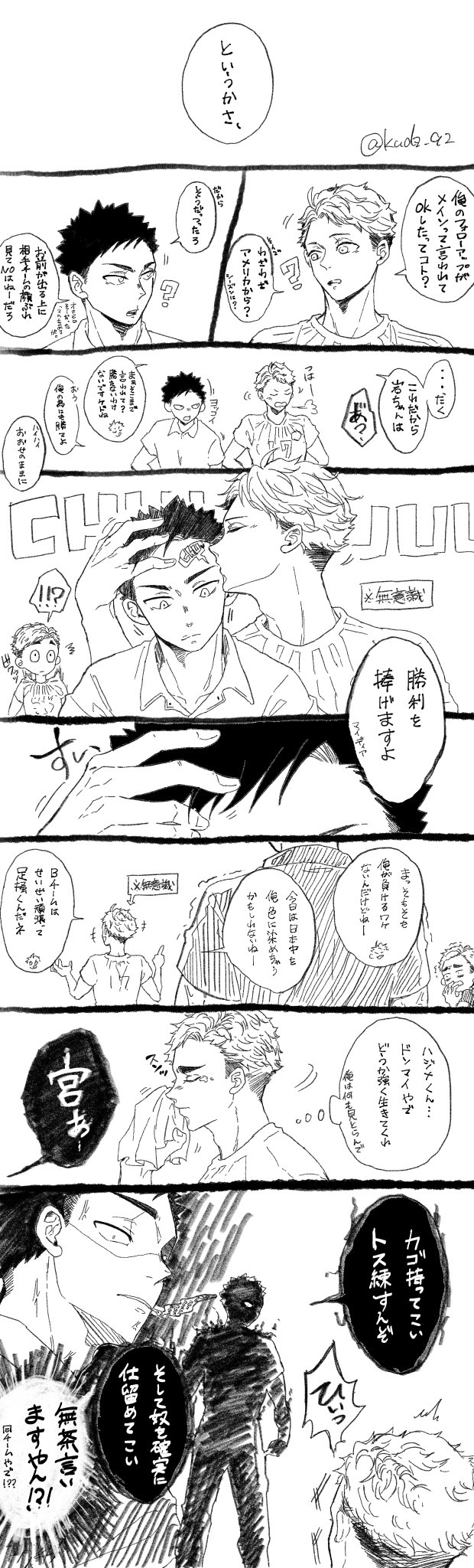 131 834 【本誌ネタ】 全人類、刮目せよ 取るに足らないこのプライド、とくと見るがいい!! っていう、最後のページが描きたかっただけの、ARレベルの幻覚と最大火力の願望を煮詰めた妄想闇鍋マンガです。何でも許せる人向け。 及岩だよ! 20/06/07 00:02