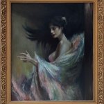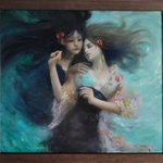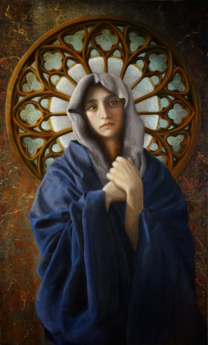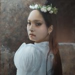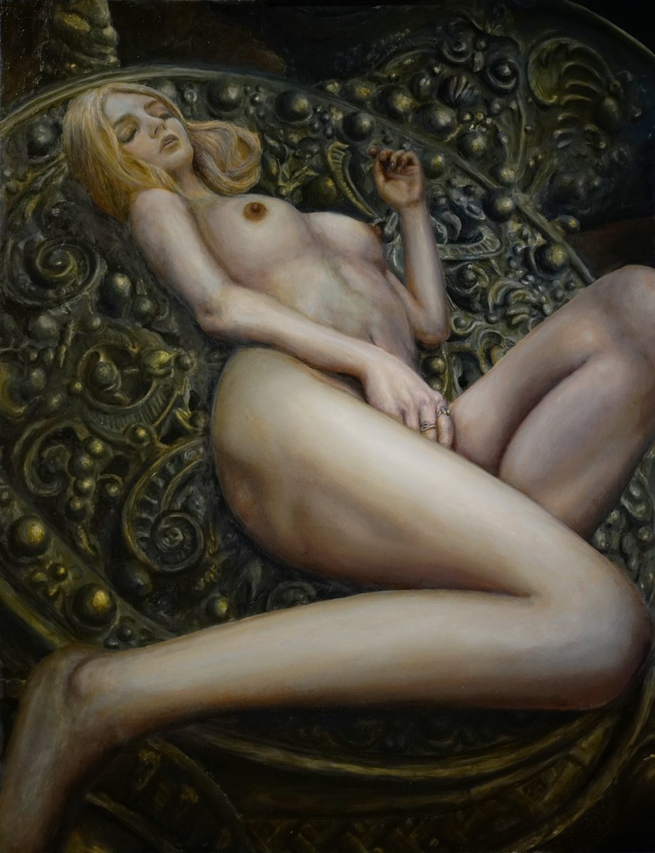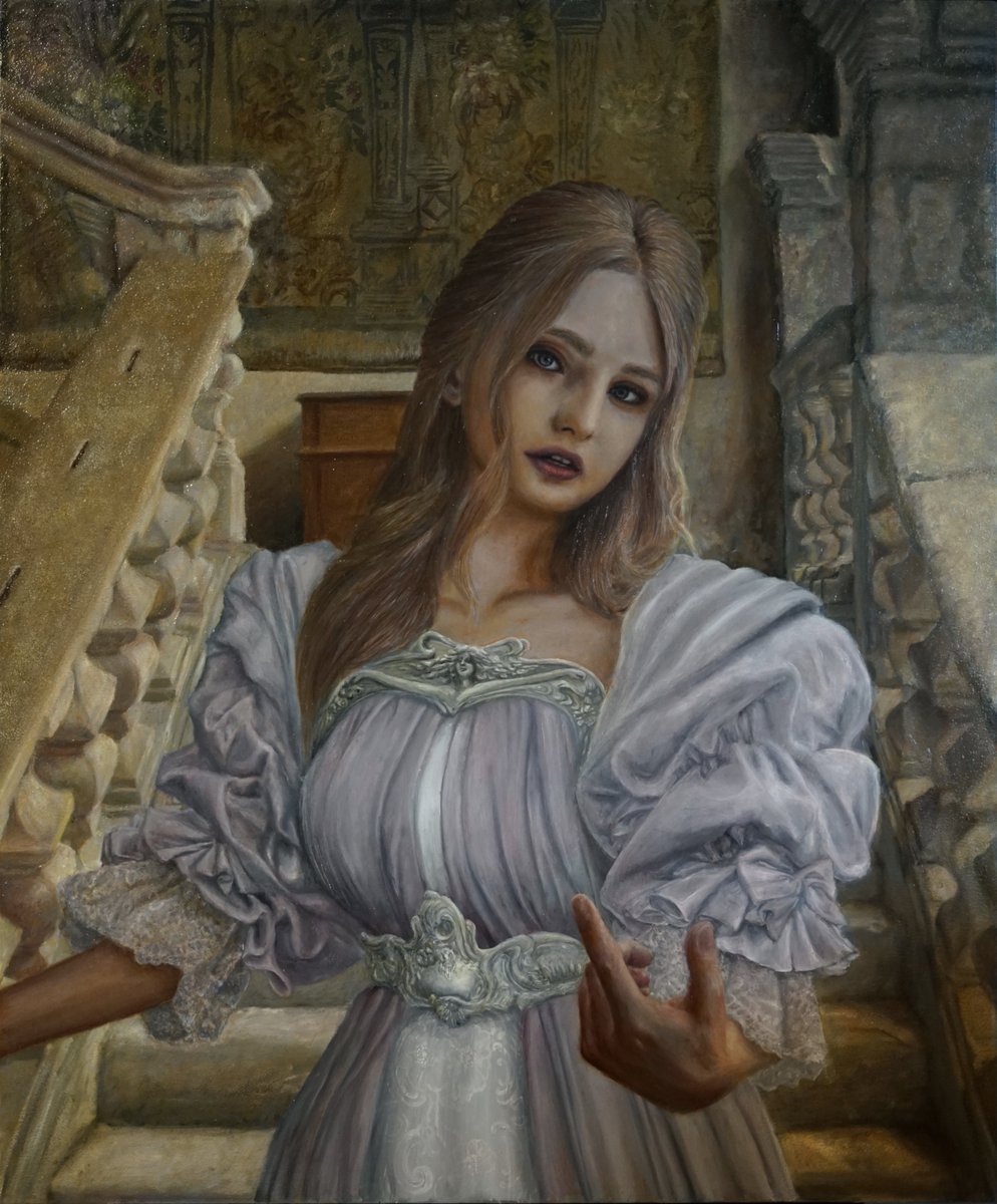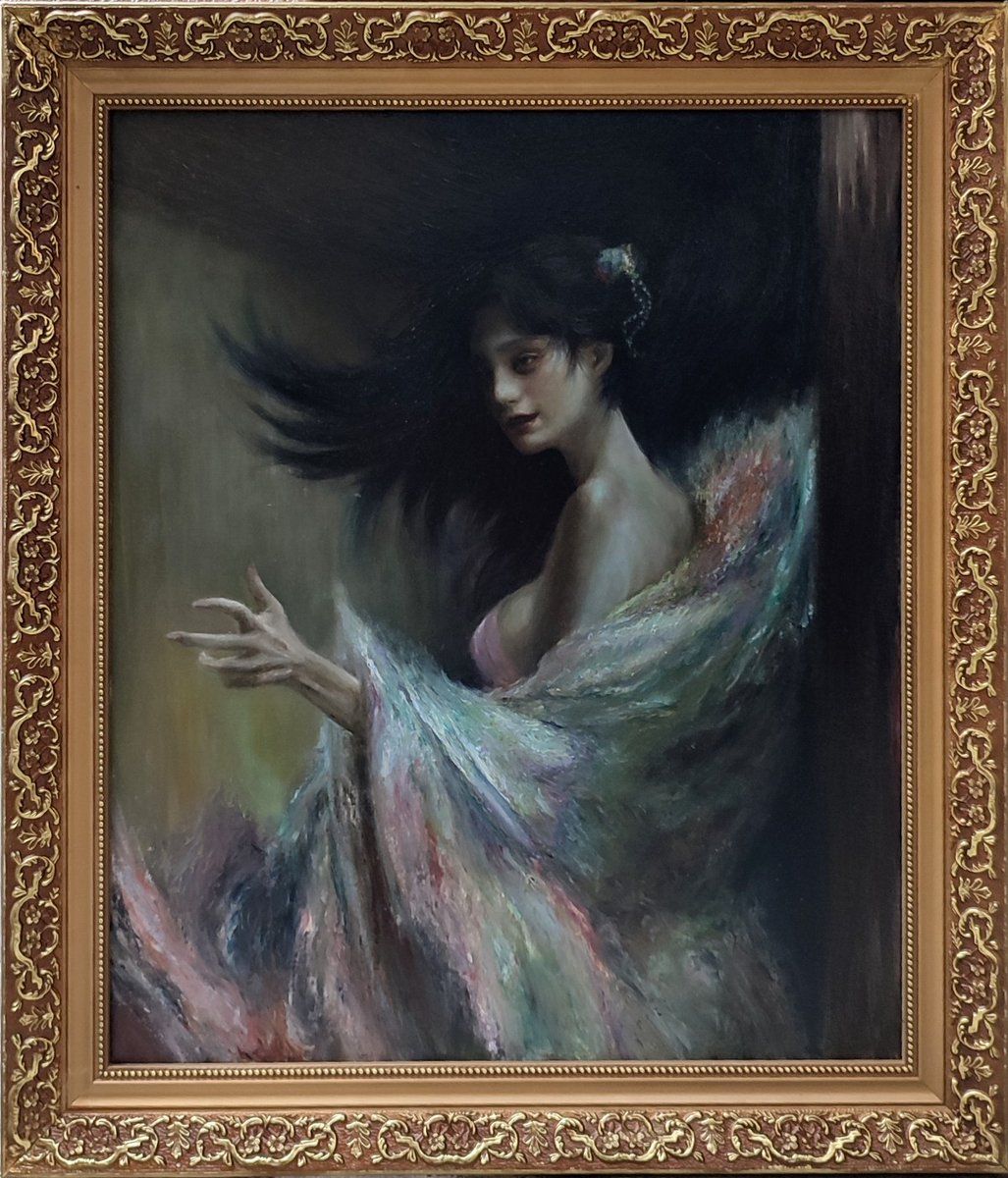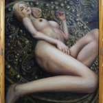 新作油絵がんばって描きました。未乾燥なので写真うまく撮れませんでしたが。作品解説も載せておきます。 タイトルは「賢しく傅く美し女(さかしくいつくくわしめ)」 #少しでもいいなと思ったらRTといいねお願いします