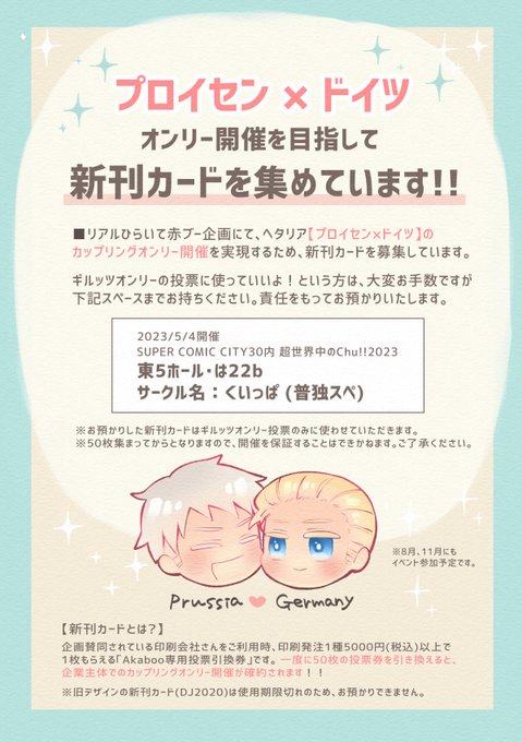 46 52 【募集】リアルひらいて赤ブー企画で《ギルッツオンリー》開催を目指して新刊カードを集めます。ギルッツオンリーの投票に使っていいよ!という神はお手数ですが、 【5/4 スパコミ(せかちゅ)東5ホール・は22b】までお持ちいただけますと幸いです。何卒よろしくお願いいたします!!🙇♀️ 23/05/03 20:10