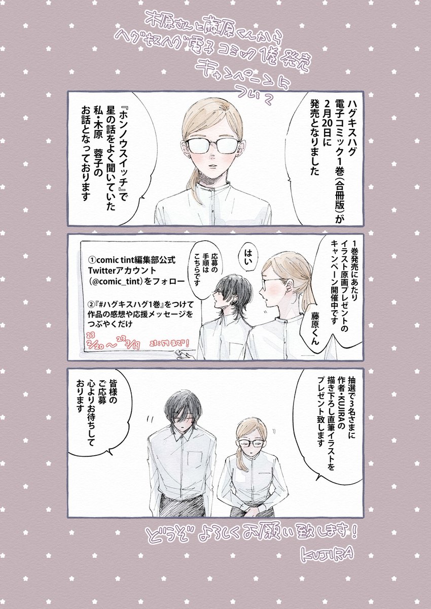 ひと段落つきました! 2月20日に『ハグキスハグ』電子コミックス1巻が発売となりました。描き下ろしオマケ漫画は藤原くんがまだアルバイトだった時のお話です。1巻発売キャンペーンも実施中です。ぜひ #ハグキスハグ1巻 で呟いてくださいね。よろしくお願いいたします!