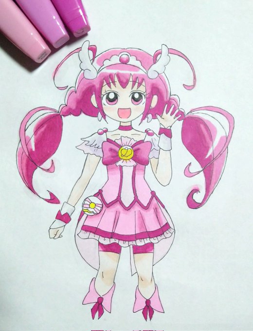 キュアハッピー描きました!💗 アルコールマーカーが滲んじゃって はみ出しまくってます😂💦 #precure #プリキュア好きさんと繋がりたい #絵描きさんと繋がりたい