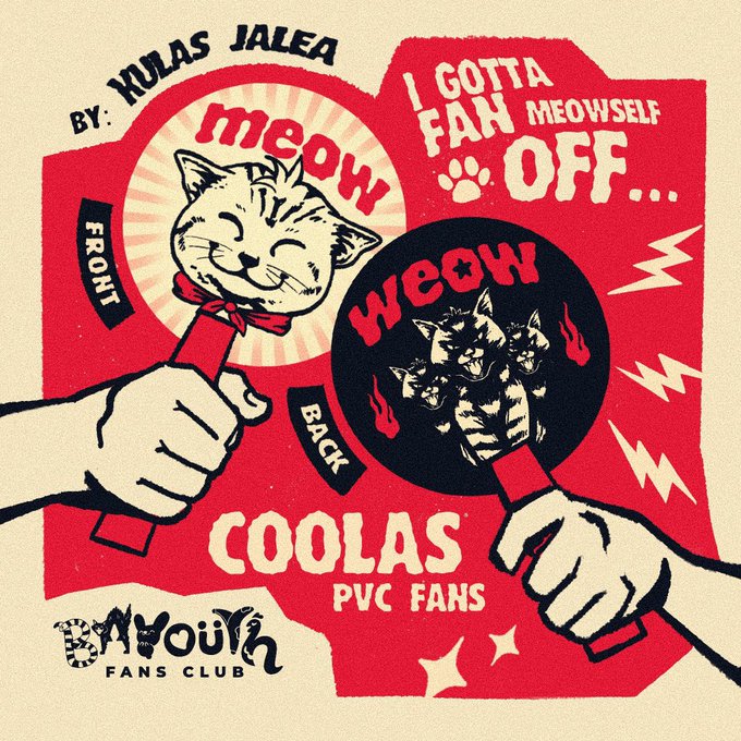 “I gotta fan meowself off, I gotta cool it down (heated)!”🔥 Happy to share that my fan merch debut is here! “COOLAS: 𝗠𝗘ow 🐱 and 𝗪𝗘ow 😾❤️🔥⭐️💥⚔️🚩” pvc fans will be available this Komiket Pride! Limited stocks only so see you! 🤲 twitter.com/i/web/status/1…