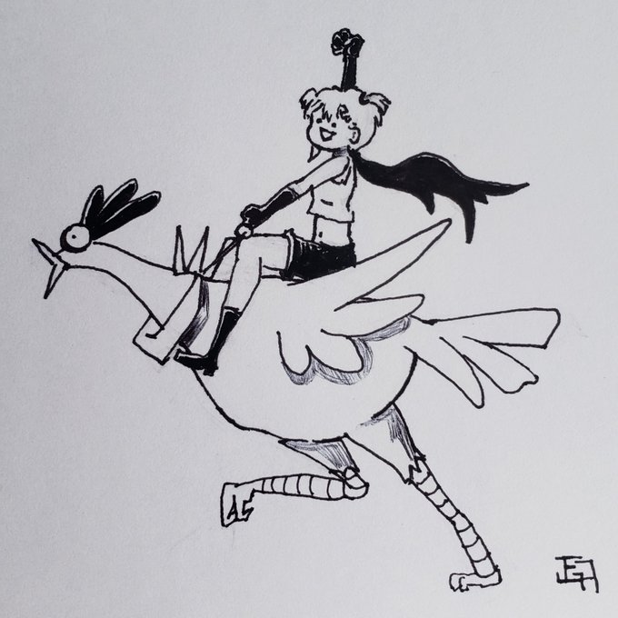 Día 16 Fowl/cuernos/vampira Lunita con capa de vampira en una montura al estilo chocobo #inktober2022 #vnekoctober #rurinktober #rurillust #VtuberES