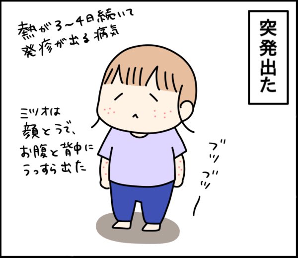 突発性発疹、またの名を不機嫌病というらしいんだけど納得ーー!!1週間近くとにかく不機嫌!ずーっと泣いてたよ👶💦#育児漫画 #漫画が読めるハッシュタグ(1/3)