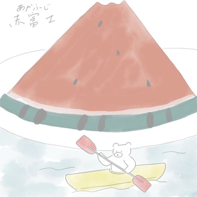 2022.8.19 赤富士(あかふじ) 晩夏から初秋にかけての早朝に、朝陽に照らされた富士山が赤く染まって見える現象のこと 赤い富士山の写真を見ていたら西瓜に見えてきたので、西瓜のお山の周りでカヤックに乗るくまさんのイメージです😂♡ #1日1絵 #イラスト #くま #すいか