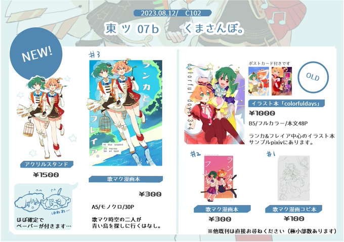 【C102 お品書き】 8/13開催のコミックマーケット102おしながきです。 詳細・更新情報などはツリーであげていきます。 1日目【東ツ07b】です~よろしくお願いします!💖🌟 #C102 #C102お品書き Webカタログ▽ webcatalog-free.circle.ms/Circle/17304207