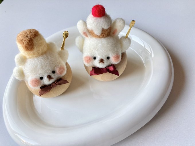 6 58 くまぷりんとうさぎカップケーキ🐰 スプーンとフォークもち🍴𓈒𓂂𓏸 ピンクッションとして使えます*´꒳`ฅ" #羊毛フェルト #ピンクッション 22/12/26 19:15