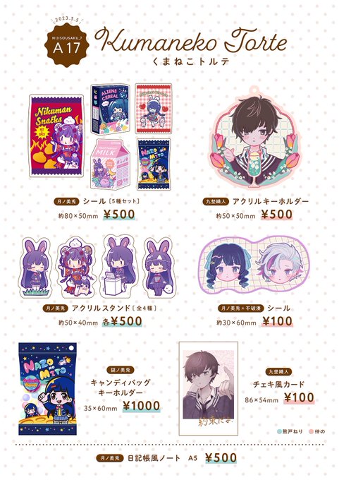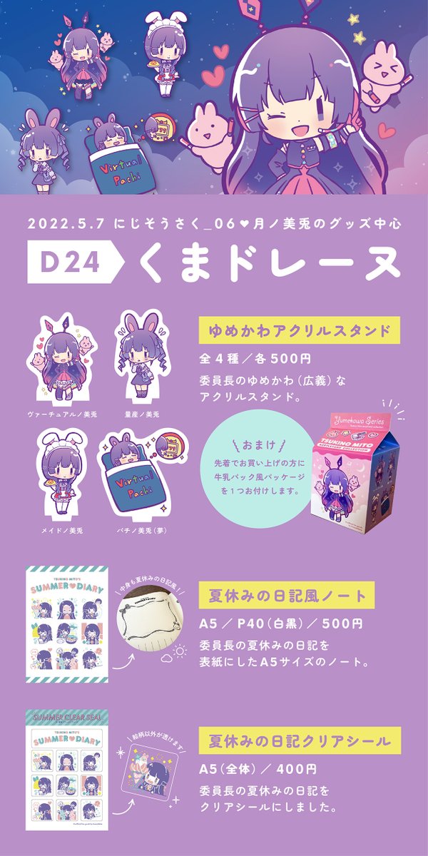 D24「くまドレーヌ」おしながきです。委員長のグッズ(アクスタ、ノート、シール)を頒布予定です🐰よろしくお願いします! グッズのサンプル写真等はツリーorこちらにまとめています👉min.togetter.com/b0YTWkR #にじそうさく06