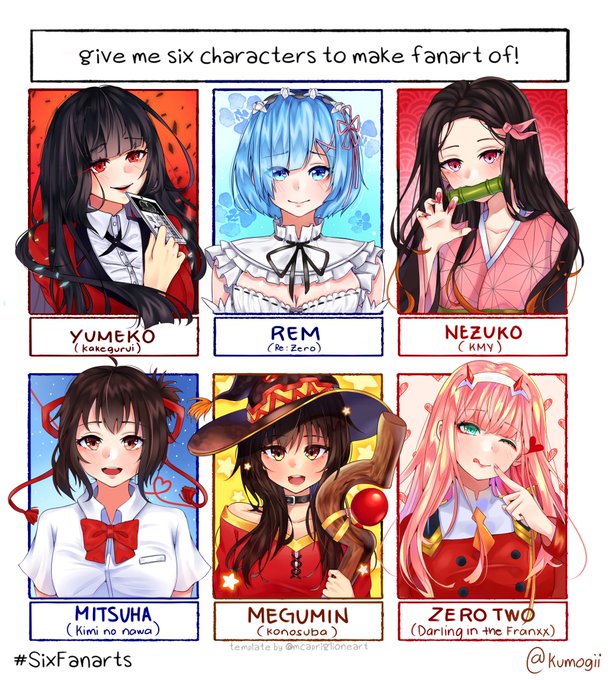 So I did the 6fanarts challenge! it was very fun yet so tiring :")) (I noticed all of these characters are all waifu material lol, which one do you prefer?) #illustration #fanart #sixfanartschallenge #sixfanarts #6fanarts #6fanartschallenge #pixiv