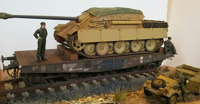 TAKOM 1/35ヤクパン&平貨車セット完成しました。人生初のビネットに挑戦したせいで4ヶ月かかりました。敷石はメダカ用濾過砂、台座や植物他は百均素材です。 #今月作ったプラモ晒そうぜ