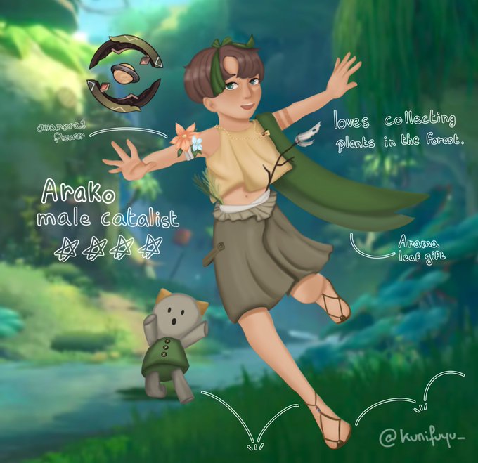 ◆ Arako* ◆ dendro ◆ Vimara village , Sumeru “ his singing cures pain and brings as much happiness as the sweetest crepuscular apple of Teyvat ” - Araphala #GenshinImpact #sumeru #scaramouche #artmoots #oc #genshinimpactfanart #artshare * Aranaras + kodomo