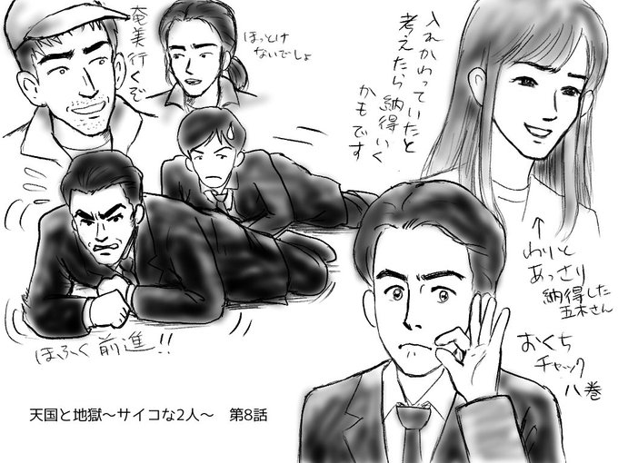 #天国と地獄 8話感想イラスト。八巻も陸もだけど有能な五木さんもわりとあっさり入れ替わり受け入れましたね。あと八巻はセク原の顔圧にも耐えておくちチャックつらぬいたね。偉いぞ八巻。