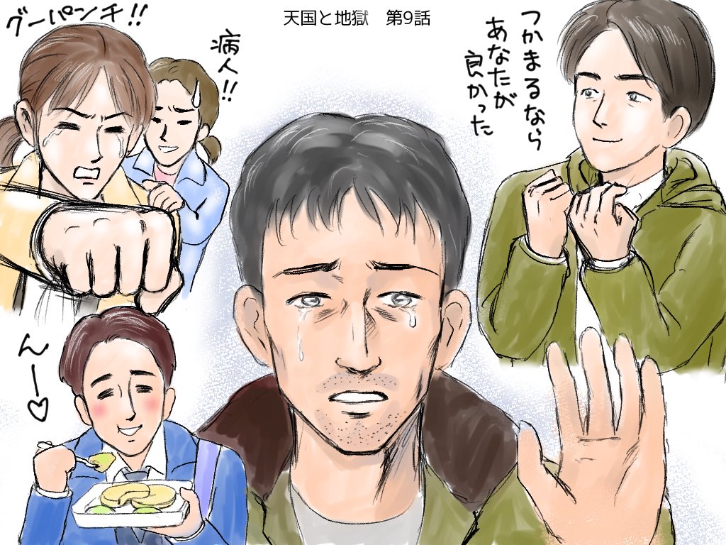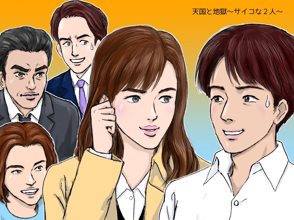 0 10 #天国と地獄 第7話の感想イラスト。ホントはもっといろいろ描きたいが力不足。サイコな2人は日高と彩子のことかと思ってたけど、ハルトとサクヤ兄弟って意味? 21/03/01 01:03