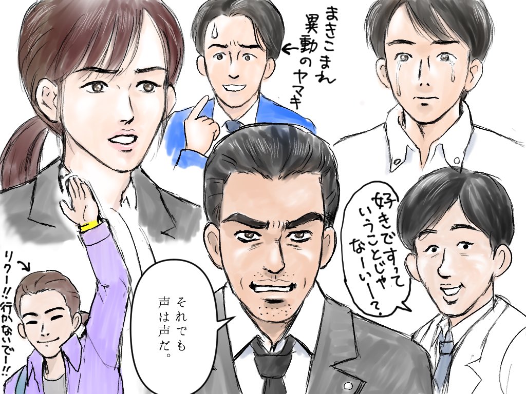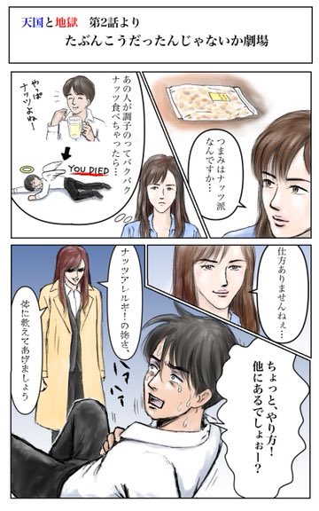 #天国と地獄 第7話の感想イラスト。ホントはもっといろいろ描きたいが力不足。サイコな2人は日高と彩子のことかと思ってたけど、ハルトとサクヤ兄弟って意味?