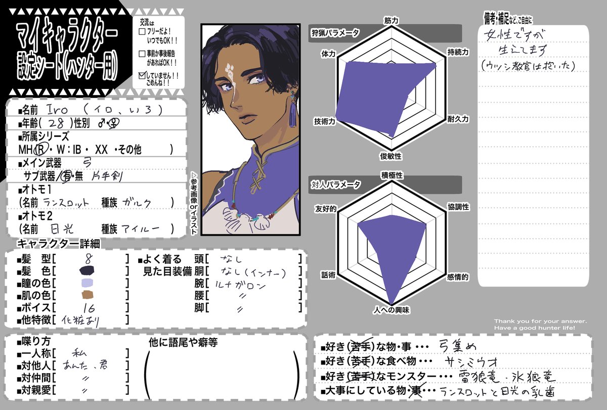 1 4 友達が描いてたので私もMHRのうちの子シート描きました(テンプレお借りしました!) オトモの名前が完全に私の私利私欲にまみれています 22/10/17 23:49