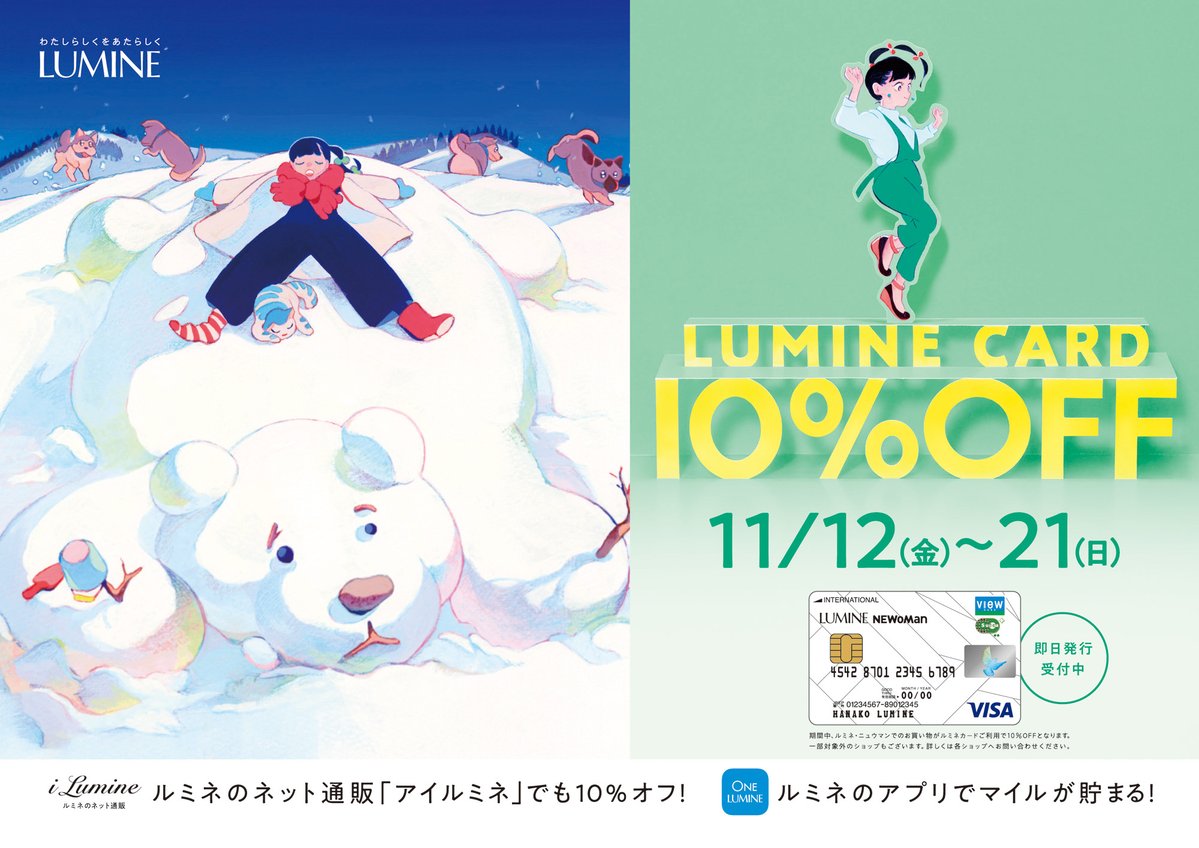 11月12日(金)より始まるルミネカード10%オフキャンペーン冬編のイラストレーション、アニメーションパートを去年から引き続き担当しています❄️☃️❄️ 今季はトレインチャンネルでもCMが流れたりするようなので電車に乗った際にぜひ見つけてみてください〜🔍🔍🔍 lumine.ne.jp/10off/202111/
