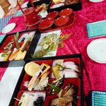 東沢さん(@YilNs)で餅つきのあとは新年会をしたよ~\(^o^)/ 血糊部屋をみんなでいい感じに設営して、課金と言うなの無茶振りなお願いをしておせち作ってもらった✨ 予想以上の豪華なおせちですごい美味しかったです! 全部美味しかったけど、大根と数の子が1番好きです!