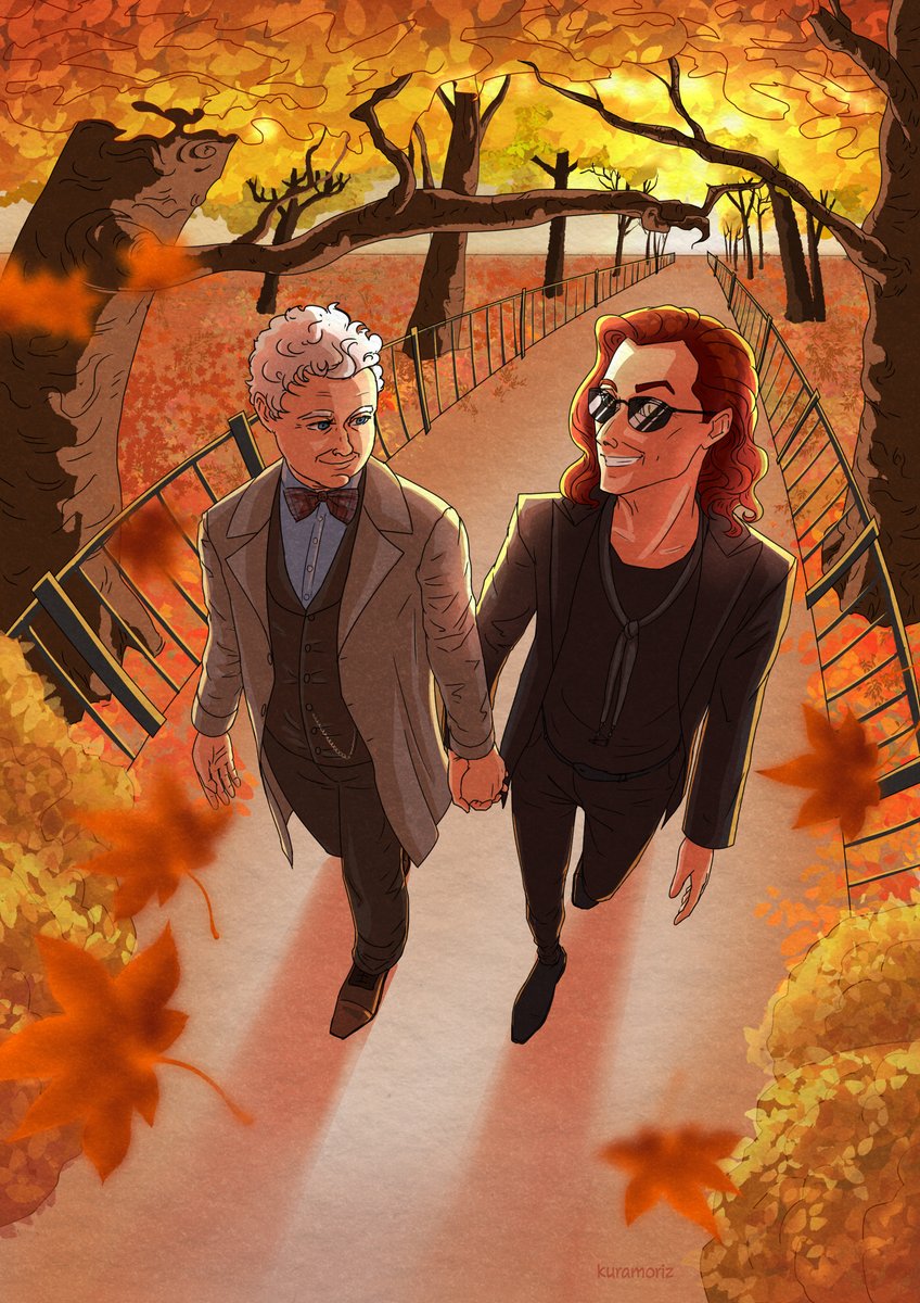 Aziraphale and Crowley are enjoying a walk together in the cold autumn weather #goodomens #goodomensfanart #ineffablehusbands