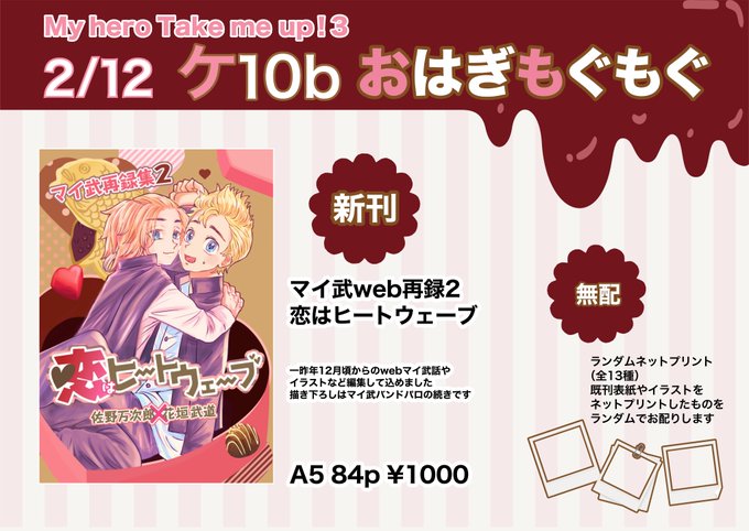 2/12TOKYO罹破維武13のお品書きです。 新刊1種と無配のランダムネットプリントがあります。 どうぞ宜しくお願いします🙇♀️ ↓新刊サンプル twitter.com/kurian555/stat…