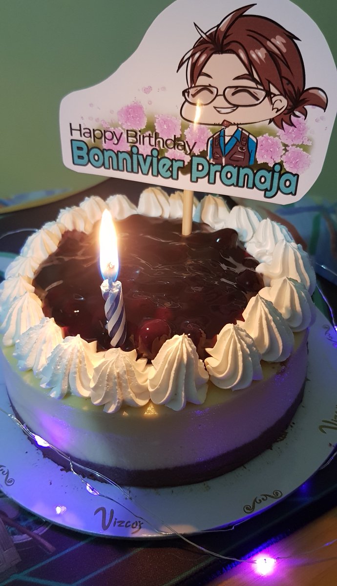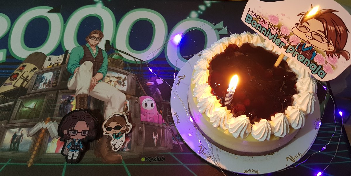 Happy Birthday Om Bonni~! Have some blueberry cheesecake (I drew the cake topper, sorry if rushed :pepefins:). The shrine's small, but still good. Deskmat design by @koactus (produced w/permission), and charms from @KyraMerch. #bonratulation #bonnivierart