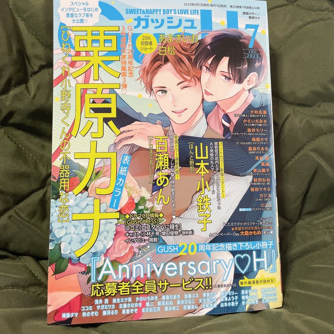 本日発売のGUSH7月号に表紙カラーと4話を掲載してもらってます🌼 #ひねくれ小野寺くんの不器用な恋 インタビュー記事とキャラクタープロフィールなどもあるのでよければチェックしてみてください💜
