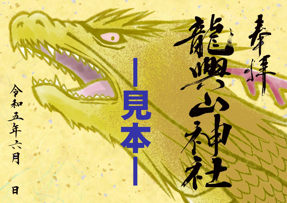 5 4 青森県「龍興山神社」様の御朱印の絵の部分を描かせていただきました。 6月4日、例大祭用 特別御朱印です。 🌸通常御朱印 初夏 も出来ました 当日受け取り・通販のネット予約は下記ツイートから。 置き型の御朱印です。実物は朱印が押されます。 龍の方は黄土色の部分が金印刷になっております。 23/05/09 19:33
