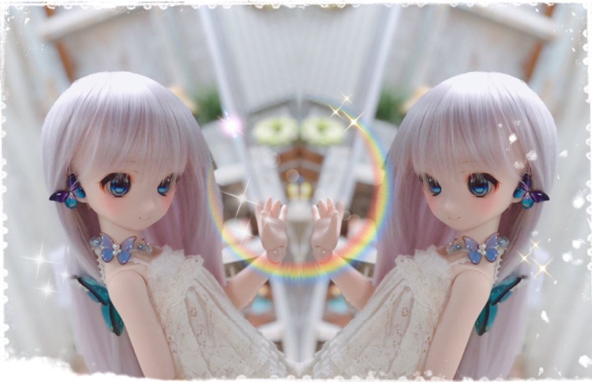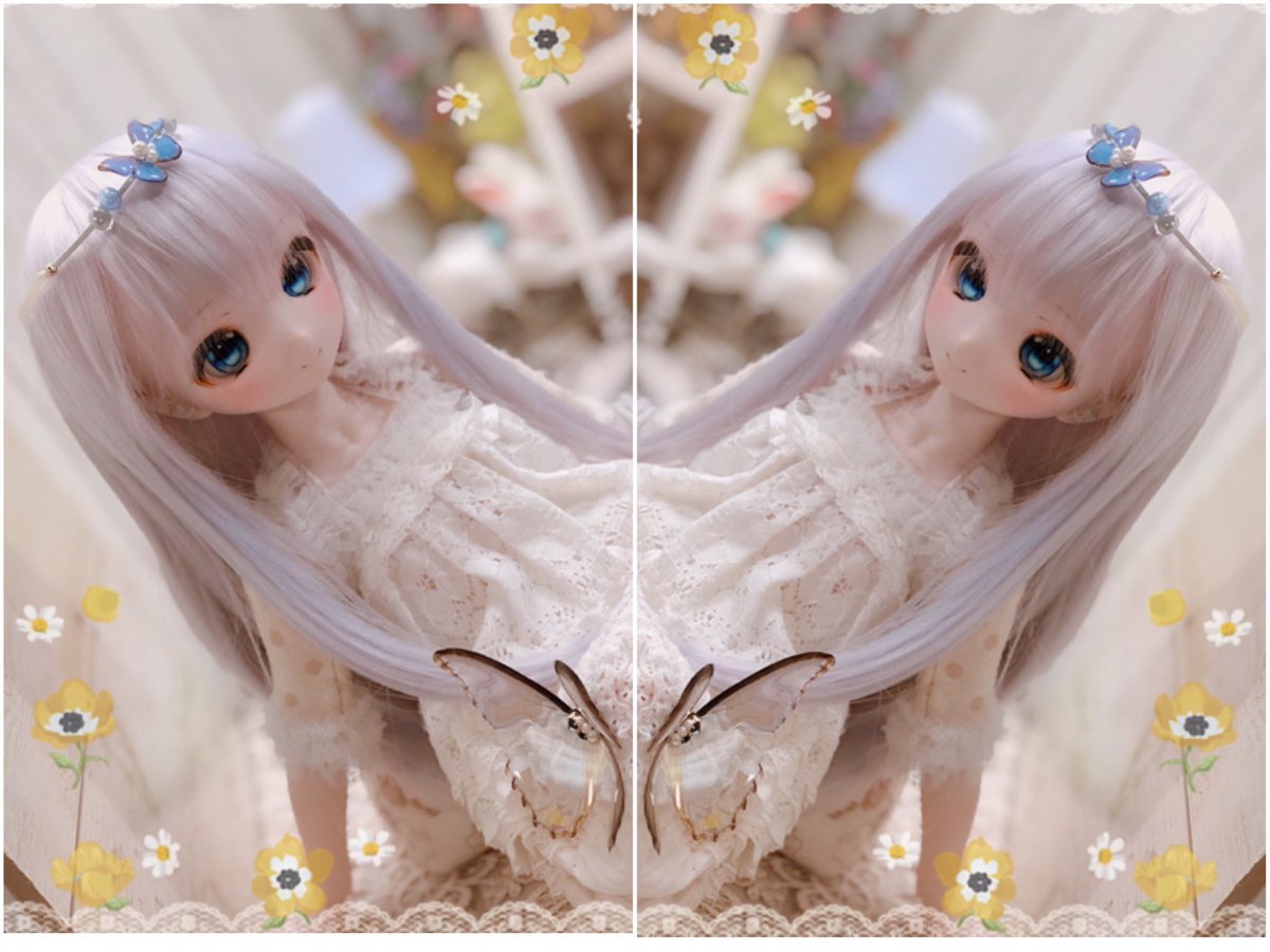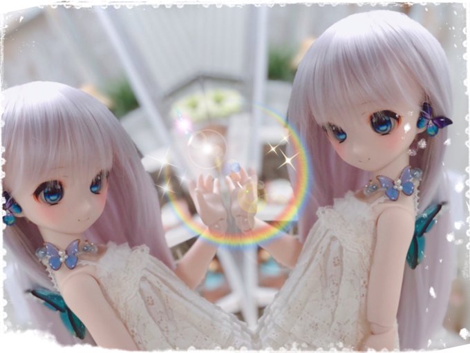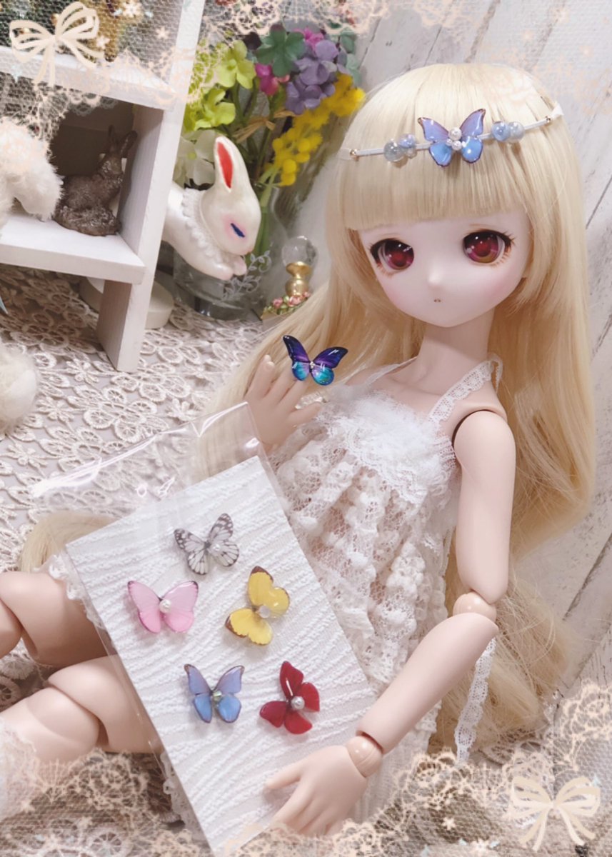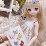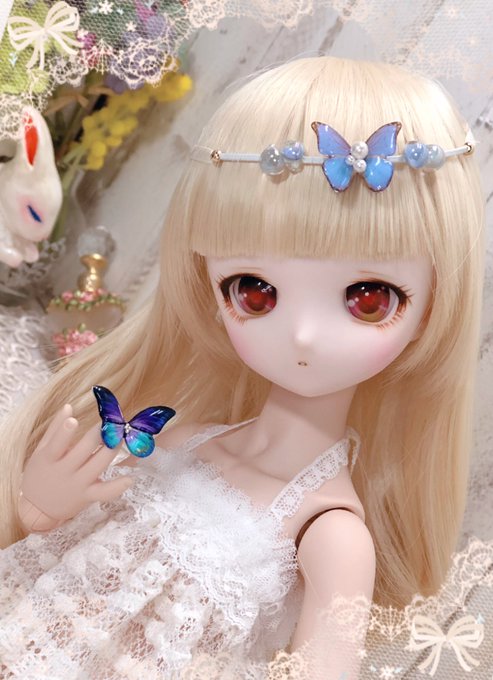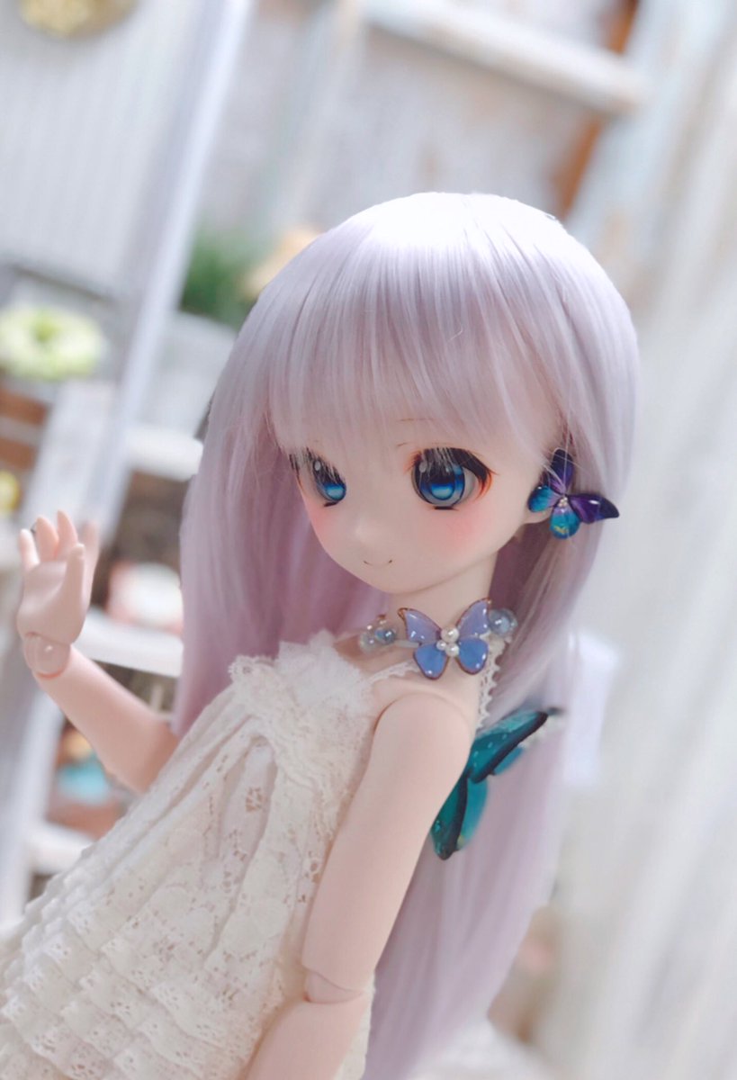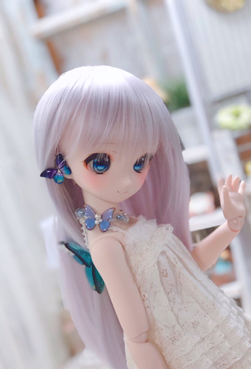 この淡いパープルのウィッグと 青いアイに @Butterflybrand2 さんの 蝶達がよく似合う(〃´-`〃)♡ リアルな蝶は苦手のくせに 蝶モチーフは好きなんだな~🦋 #MDDはいいぞ #狐花っこ