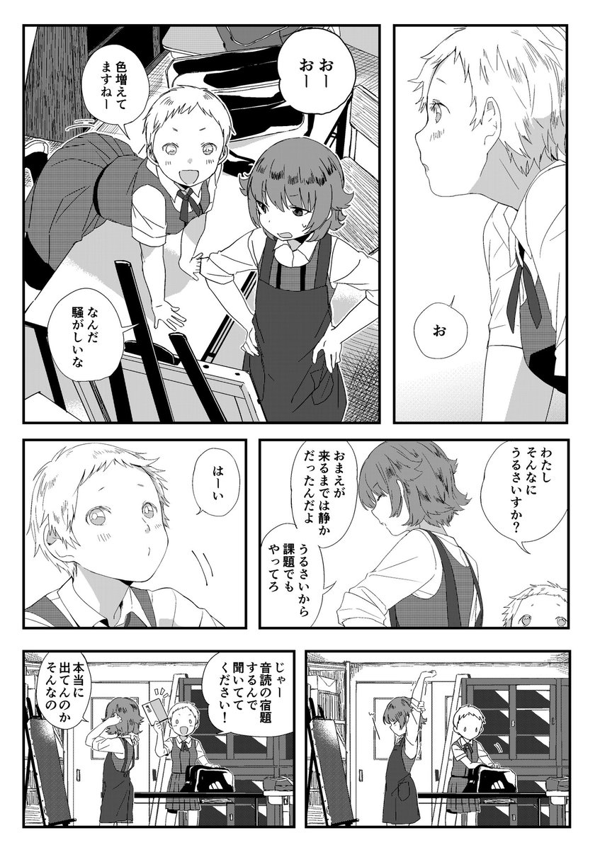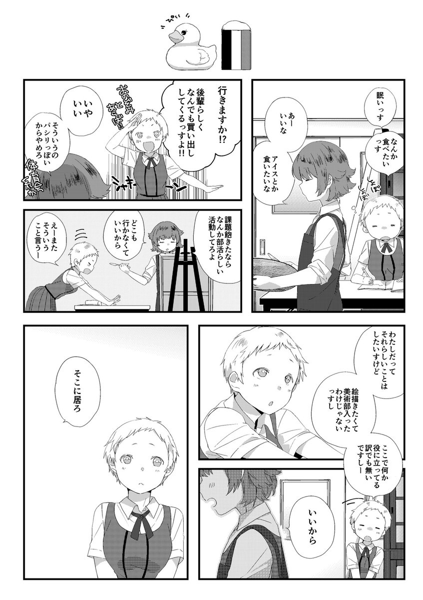 8 21 「今日の美術部」(全14ページ 1/4) 先輩と後輩が美術部でお喋りする感じの漫画です。 #創作百合 #漫画が読めるハッシュタグ ↓下に続きます↓ 20/09/29 14:07