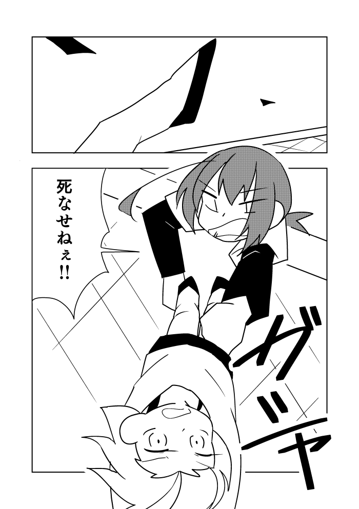 #このタグを見た人はラフ画とその完成絵を見せる 描けてるかは置いといて、コマぶち抜き&大袈裟につけたパースとか、わりと気に入ってるページ。漫画はページ作った時点でコマ割りするのでラフで既に枠線が黒いです~
