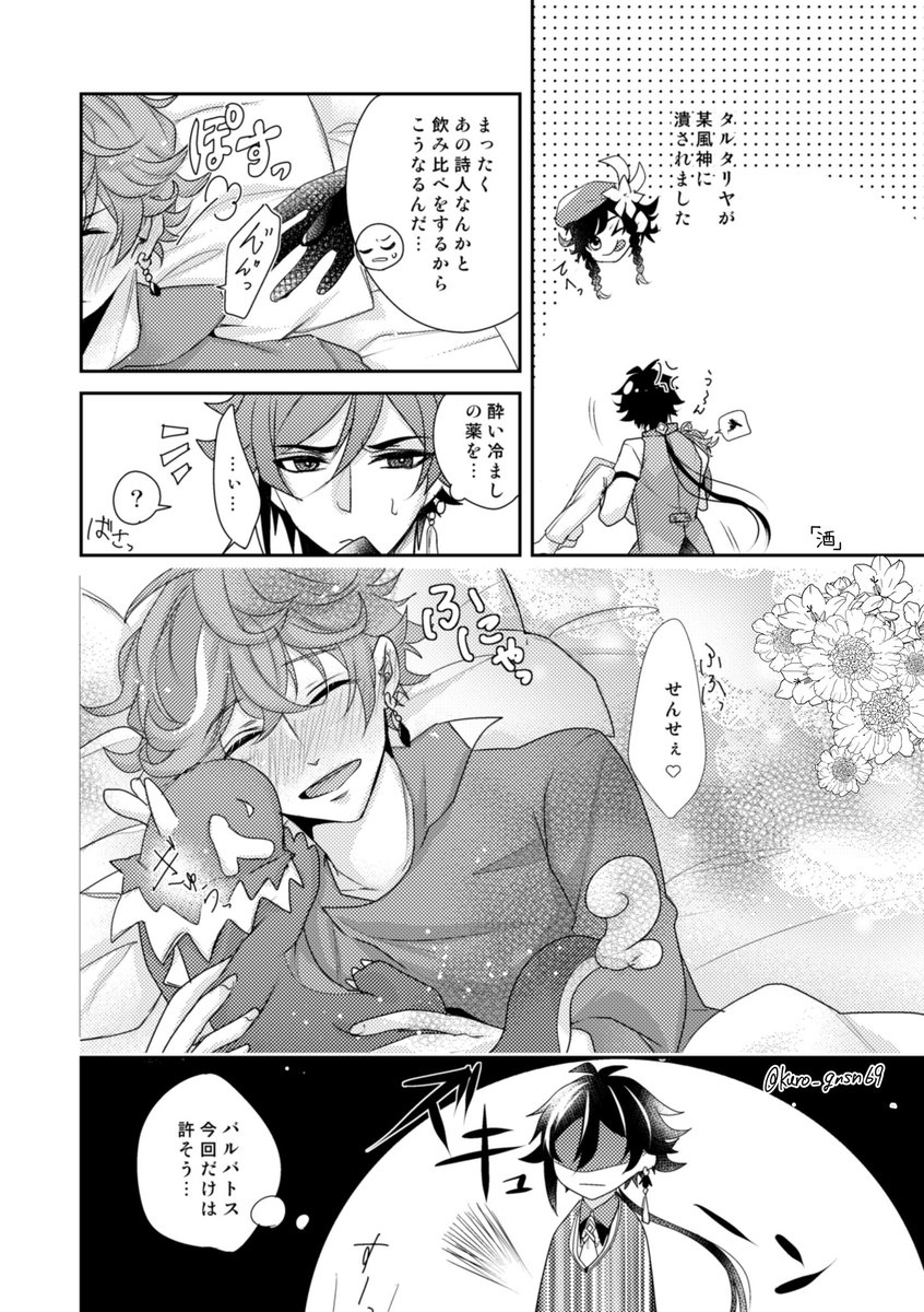 139 760 #鍾タルワンドロ·ワンライ お題「酒」(+3h)※誤字があったので再投稿です。 目に毒的なのも入れたくてタルはだけてましたけど全年齢にしました← 🔶「耐えた俺を褒めて欲しい」 21/10/24 22:07