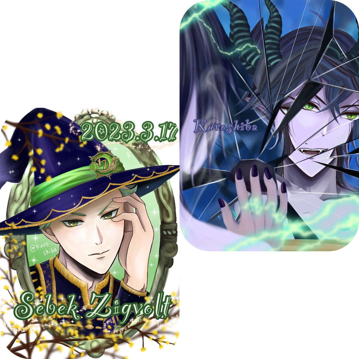 #2023年自分が選ぶ今年上半期の4枚 見返したらちゃんと描いてるイラストが少なくて… 圧倒的タマムイが最高でした、推しイベ やたらヴィル様を描いてる キングスカラーは全部線画で止まってました(5、6枚あった) エペルは落書きですが顔が気に入ってます