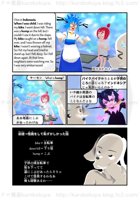 ピクセルデイズ9: 13 #漫画が読めるハッシュタグ #VRC漫画 言語交換イベントにて容赦のない英語が犬を襲う! しかし彼もまた英語ネイティブではないので語彙は平易で、いくつか繰り返し強調される「バイク」「ハンプ」などの語が聞き取れた。そして「バイク」はどうやらバイクのことじゃないらしい…