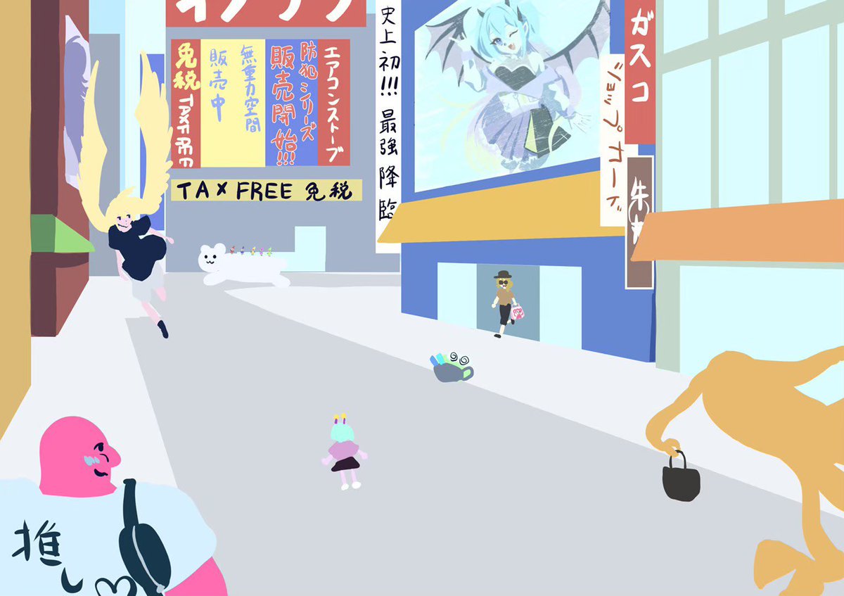 #イラスト #創作 #オリキャラ 某葉原さんをみ背景を描いてオリキャラを詰め込みました。友人のキャラも入れさせていただきました。
