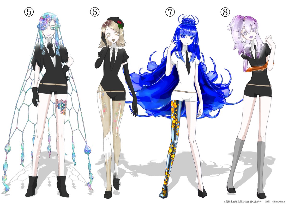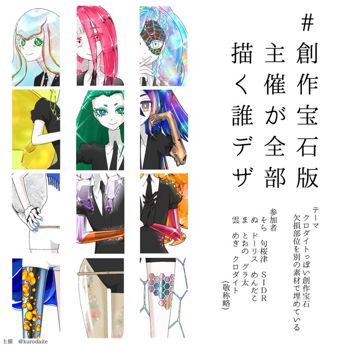 #創作宝石版主催が全部描く誰デザ ・クロダイトっぽい創作宝石 ・どこかに欠損部位があって別の素材で埋めている(欠損のままではない) で募集させていただき、全部描きました!! この中に一人だけ、私がデザインした子が紛れています。どの子でしょう? 下のアンケートで当ててみてください😆