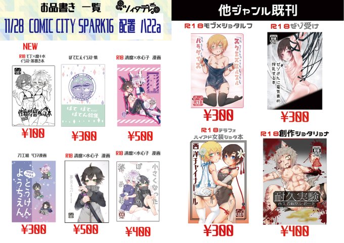 11/28のCOMIC CITY SPARK 16お品書きです 新刊はとても薄いけど性癖圧縮したらくがき本の予定です(未だ描いてる)出てたらほめてくださいよろしくお願いいたします。