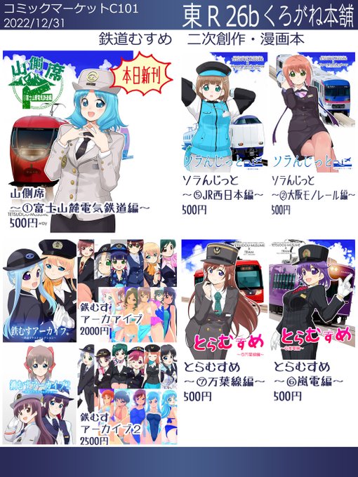 24 51 冬コミC101 お品書きです。 12/31(土)(2日目) 東R-26b くろがね本舗 よろしくお願いします。 #鉄道むすめ 22/12/29 14:01