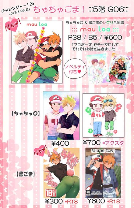 2023/3/26チャ!26のお品書きです 当日はちゃちゃ〇さん(@cha3maru)と同じスペースにいます 新刊は何とちゃちゃ〇さんとのレグリ合同誌! pixiv.net/artworks/10633…