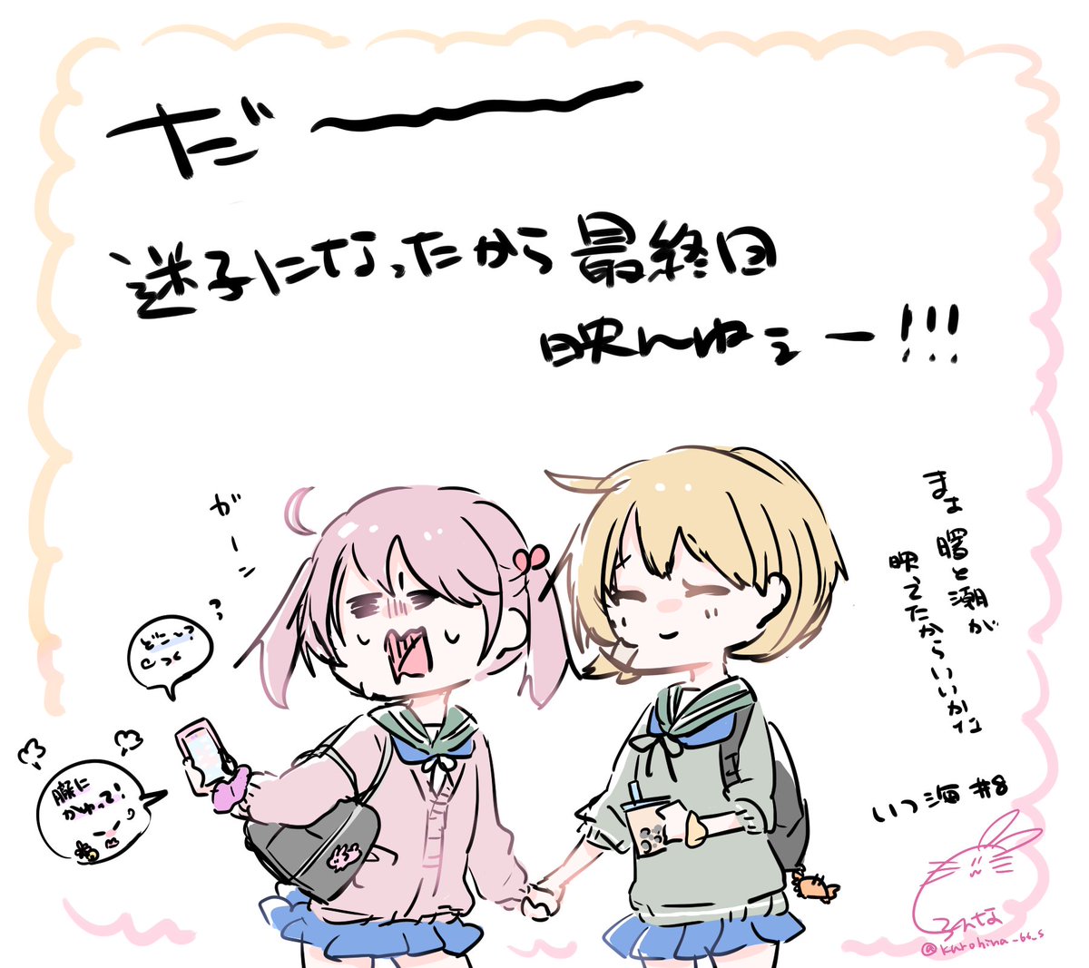 221 650 「なんなら放送前から感じてはいたけどこの場違いテンションのまま潮と曙を応援していいアニメではないかもしれない」 といつ海を観ながら思う漣と朧描きました…… みんな、生きて。 22/11/18 18:11
